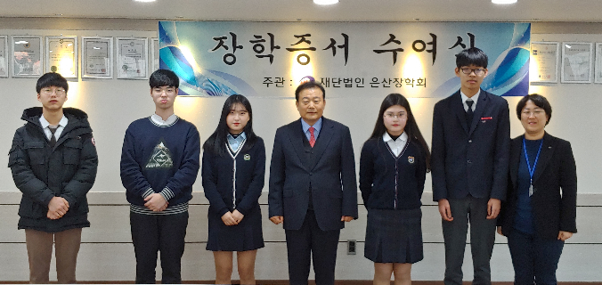 재단법인 은산장학회 1기 (2018년 2학기) 장학증서 수여식 2018년12월 24일 (월요일) (재)은산장학회 설립 후 첫 장학증서 수여식을 가졌습니다 장학금은 부산전자공업고등학교 윤 O현 학생외 5 명의 학생에게 수여되었습니다 선발된 장학생 모두 축하드리며, 앞으로도 사랑과 희망을 전달하는 은산장학회가 되겠습니다
